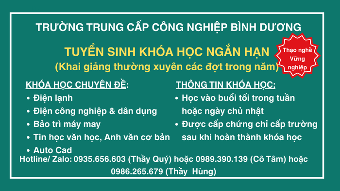 Trường Trung cấp Công nghiệp Bình Dương tổ chức các khóa học ngắn hạn chất lượng , phù hợp cho học viên vừa học vừa làm , muốn nâng cao kỹ năng trong thời gian ngắn.