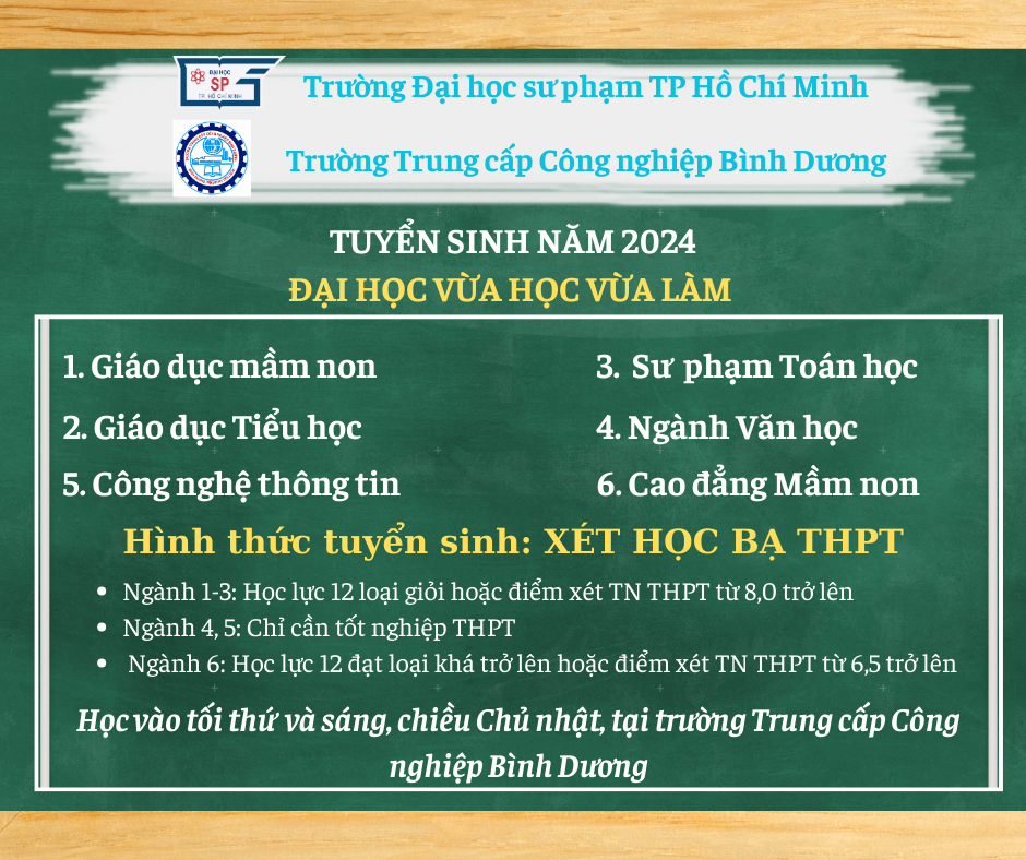 - Thời gian học tập: Tối thứ 7 và sáng/chiều Chủ nhật hàng tuần. Học online kết hợp trực tiếp tại trường Trung cấp Công nghiệp Bình Dương. Sinh viên sẽ được thông báo cụ thể khi nhập học.