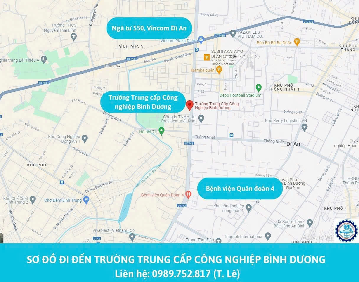 (Sơ đồ tới trường Trung cấp Công nghiệp Bình Dương, trường làm việc 7h30-21h các ngày trong tuần kể cả chủ nhật)