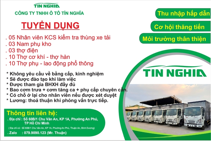 Công ty TNHH Ô tô Tín Nghĩa thông báo tuyển dụng nhiều vị trí hấp dẫn dành cho học sinh – sinh viên ngành kỹ thuật, cơ khí, điện và lao động phổ thông.