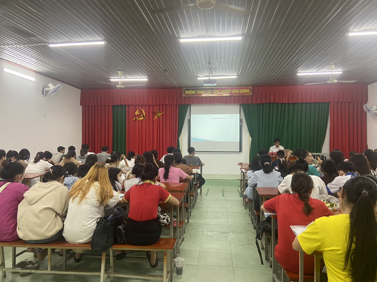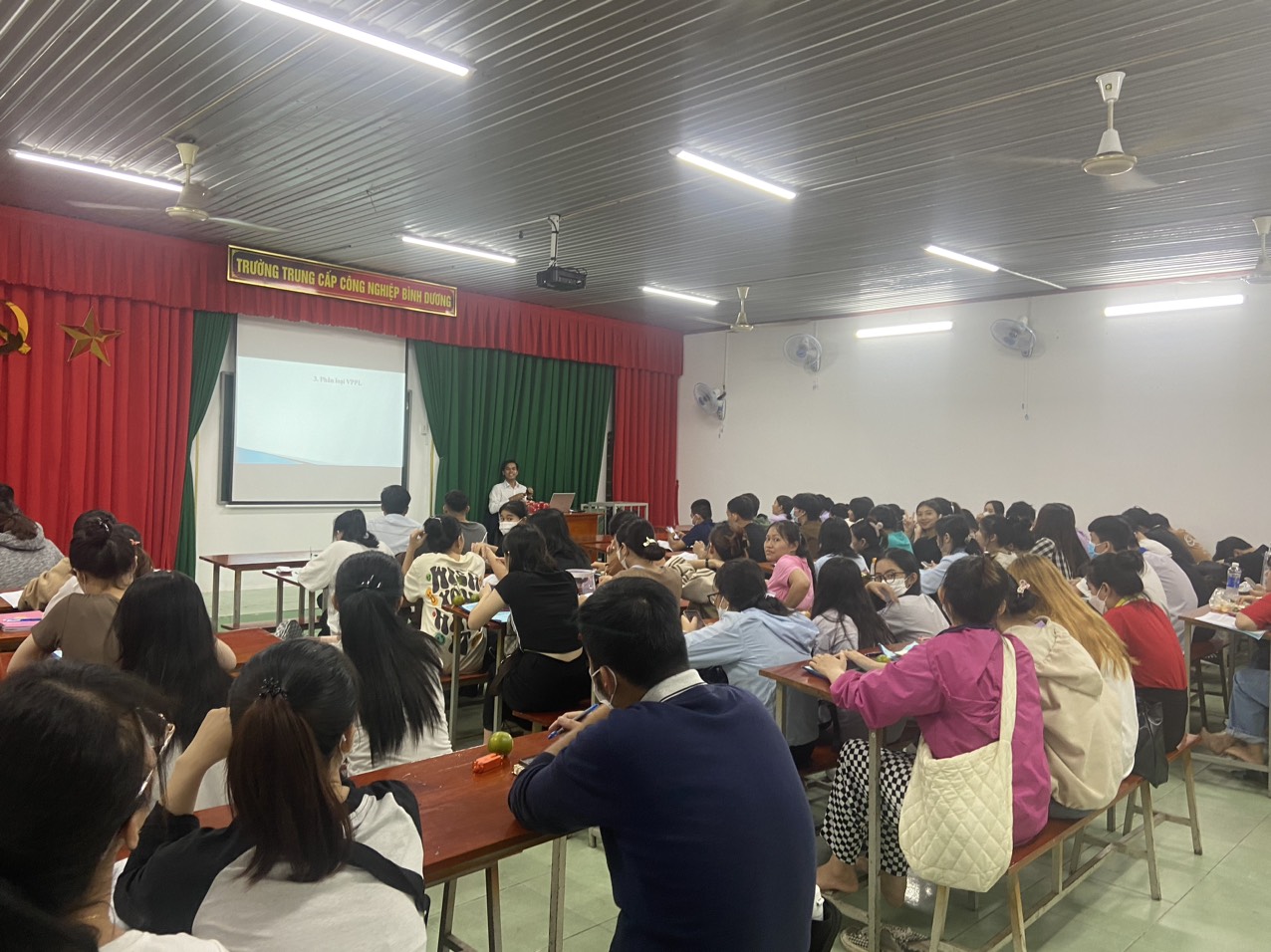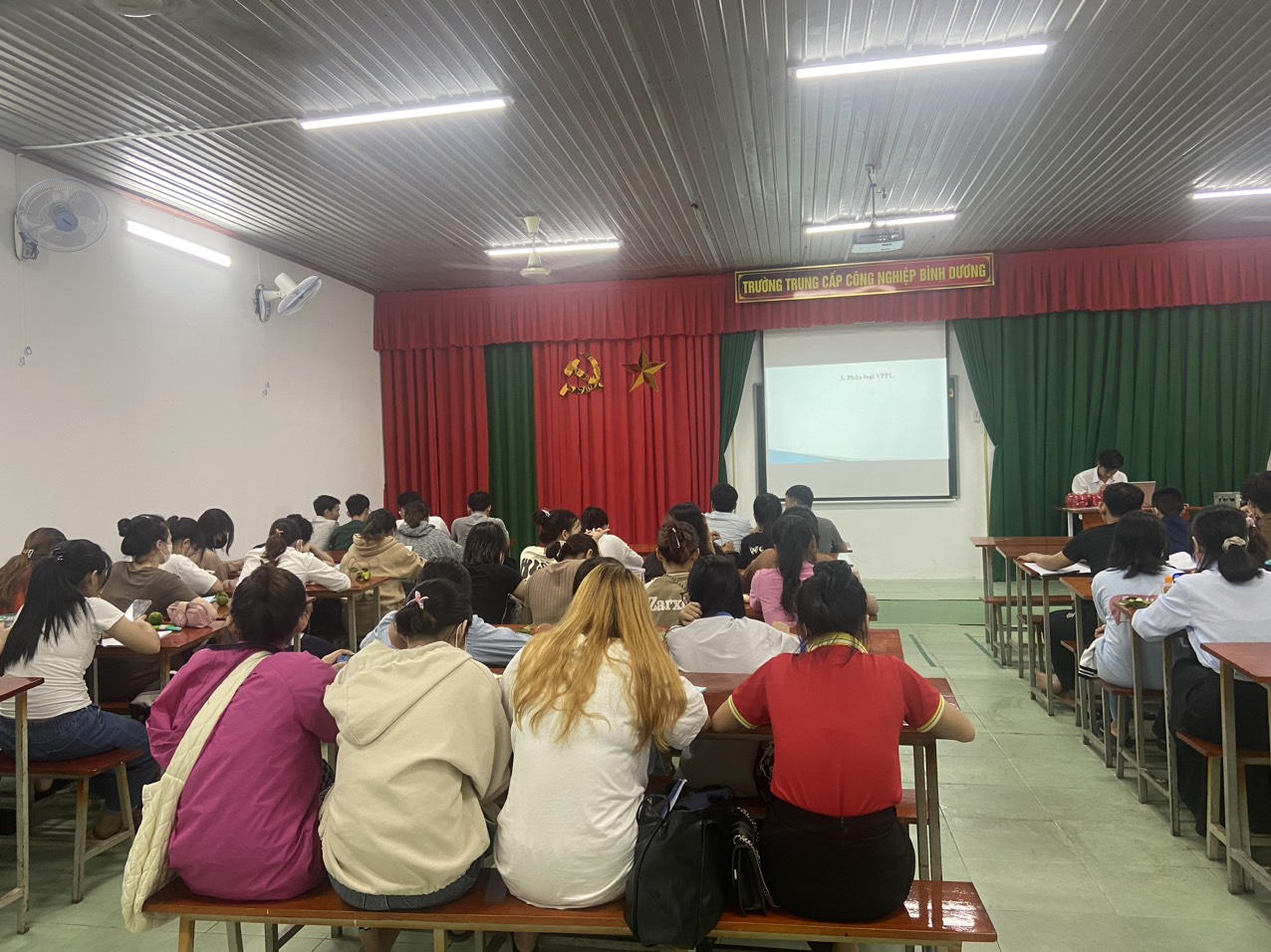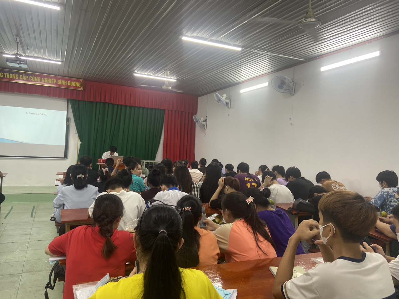 Hình ảnh một giờ học môn Pháp luật tại trường Trung cấp Công nghiệp Bình Dương. Trường có cơ sở vật chất khang trang, sạch sẽ, hệ thống quạt treo tường, quạt trần; hệ thống máy chiếu mới và hiện đại nhất,...nhằm phục vụ tốt nhất công tác giảng dạy.