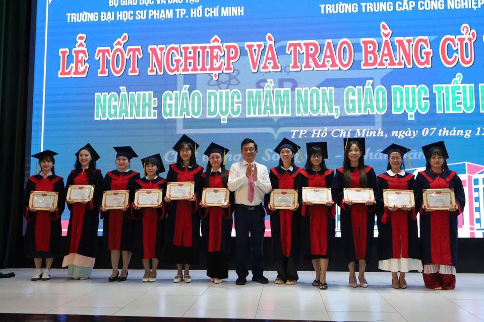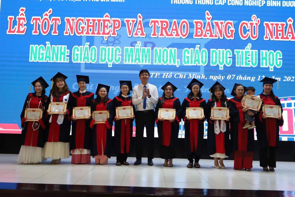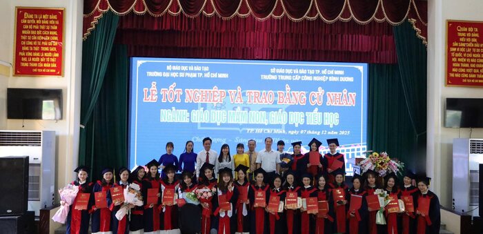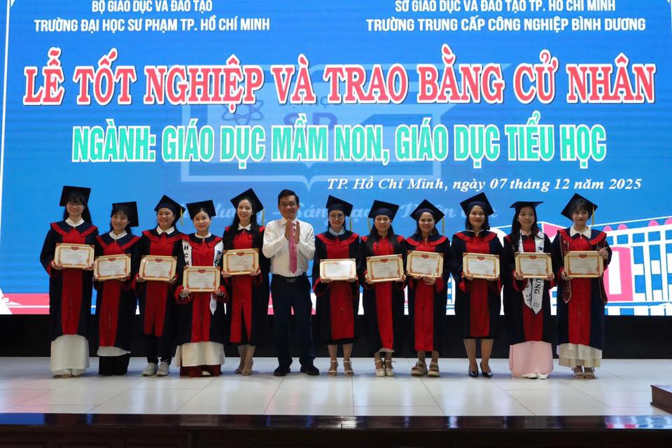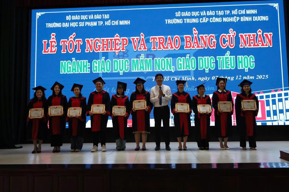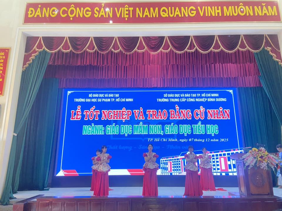 Sáng ngày 07/12/2025, tại Trường Trung cấp Công nghiệp Bình Dương đã long trọng diễn ra Lễ tốt nghiệp và trao bằng cử nhân cho các sinh viên ngành Giáo dục Mầm non và Giáo dục Tiểu học thuộc chương trình liên kết đào tạo với Trường Đại học Sư phạm TP.HCM.