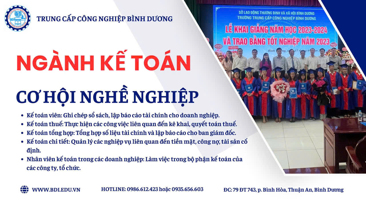 Ngoài những lý do trên, nếu bạn đang tìm kiếm một trường đào tạo chất lượng để theo đuổi ngành kế toán hệ trung cấp, Trường Trung cấp Công nghiệp Bình Dương hiện đang tuyển sinh cho khóa khai giảng vào ngày 15/03/2025. Với môi trường học tập năng động, đội ngũ giảng viên giàu kinh nghiệm và cơ sở vật chất hiện đại, trường sẽ giúp bạn trang bị đầy đủ kiến thức và kỹ năng cần thiết để thành công trong nghề kế toán. Đừng bỏ lỡ cơ hội này để bắt đầu hành trình sự nghiệp của mình!