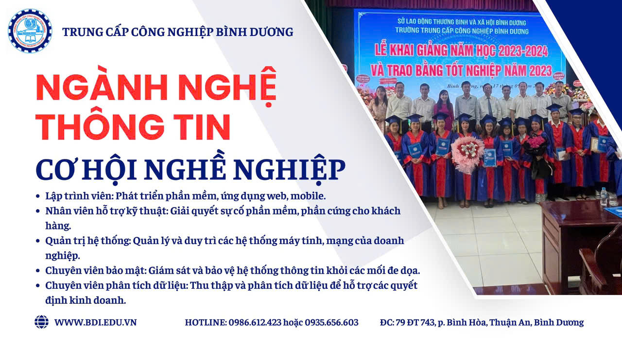 Tại trường Trung cấp Công nghiệp Bình Dương, hiện đào tạo ngành công nghệ thông tin, thời gian học buổi tối từ 18h30-21h, tuần khoảng 3/4 buổi, thời gian học 4 kì trong 1,5 năm, phù hợp vừa học vừa làm. Sau khi hoàn thành chương trình, sẽ được cấp bằng trung cấp chính quy, học viên muốn liên thông lên cao đẳng thì chỉ 01 năm ngay tại trường.