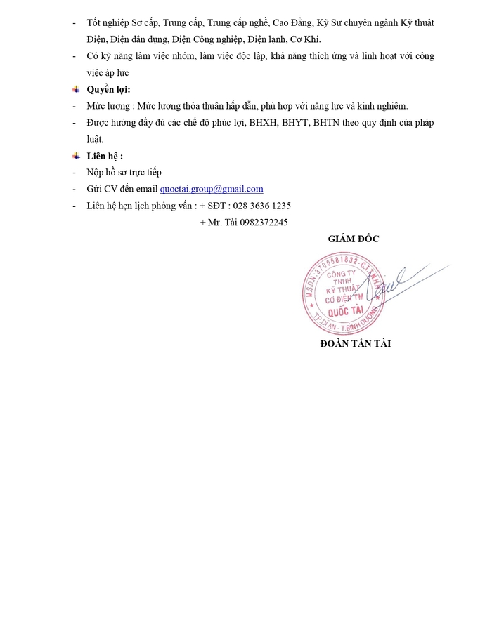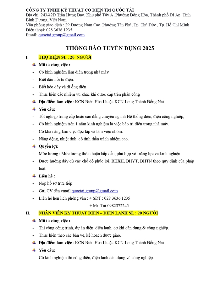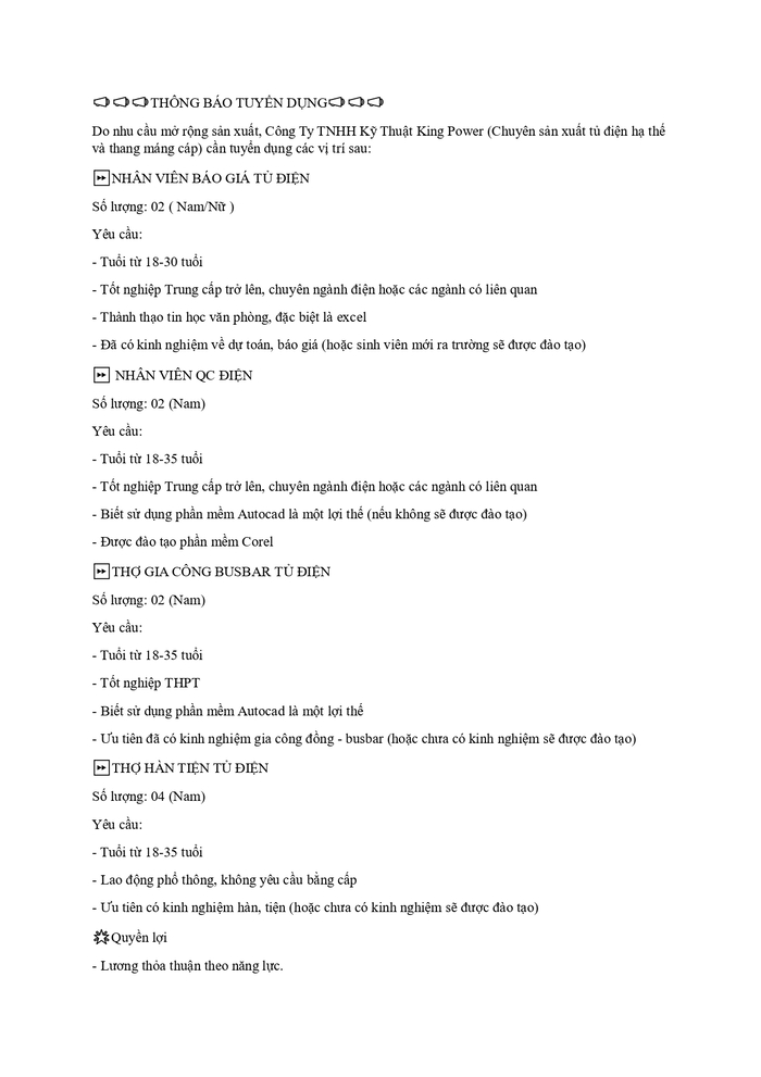 3. Công Ty TNHH Kỹ Thuật Cơ Điện TM Quốc Tài và Công Ty TNHH Kỹ Thuật King Power (chuyên sản xuất tủ điện hạ thế và thang máng cáp) đang tuyển dụng nhiều vị trí hấp dẫn: