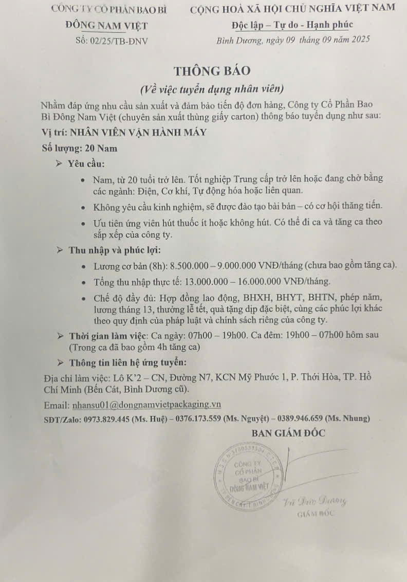 THÔNG BÁO TUYỂN DỤNG THÁNG 9/ 2025